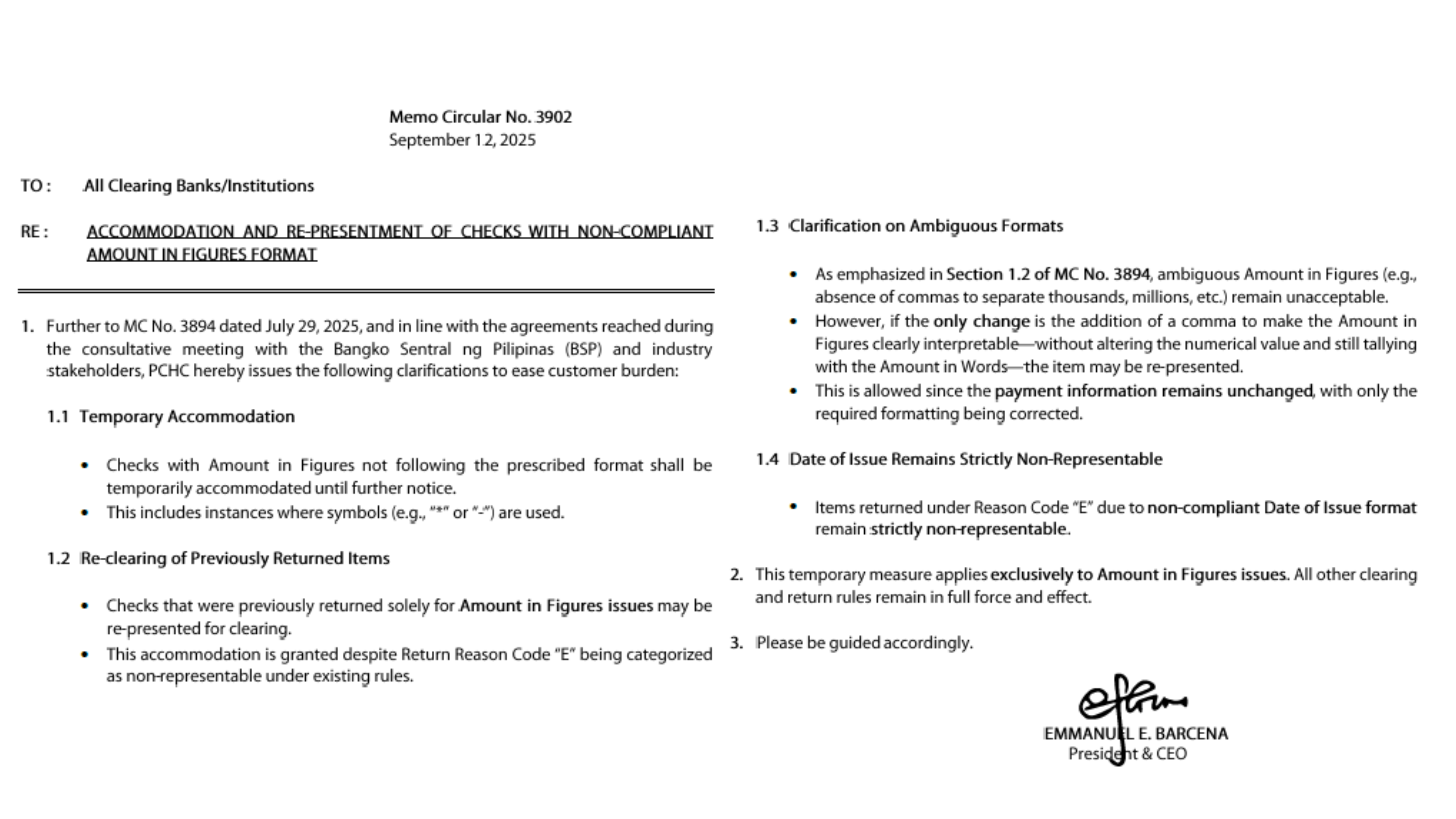ACCOMMODATION AND RE-PRESENTMENT OF CHECKS WITH NON-COMPLIANT AMOUNT IN FIGURES FORMATSeptember 16, 2025
